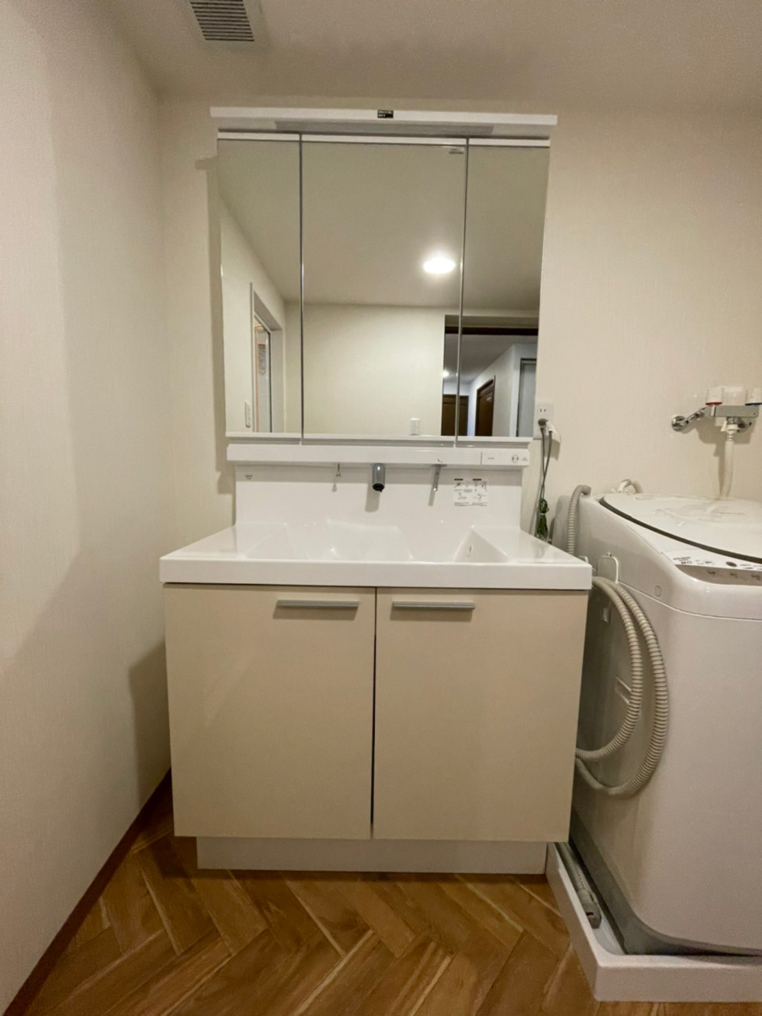 洗面台は、化粧鏡側から水栓がでているタイプにすることで、水栓周りの掃除がいらないタイプをご提案させて頂きました。