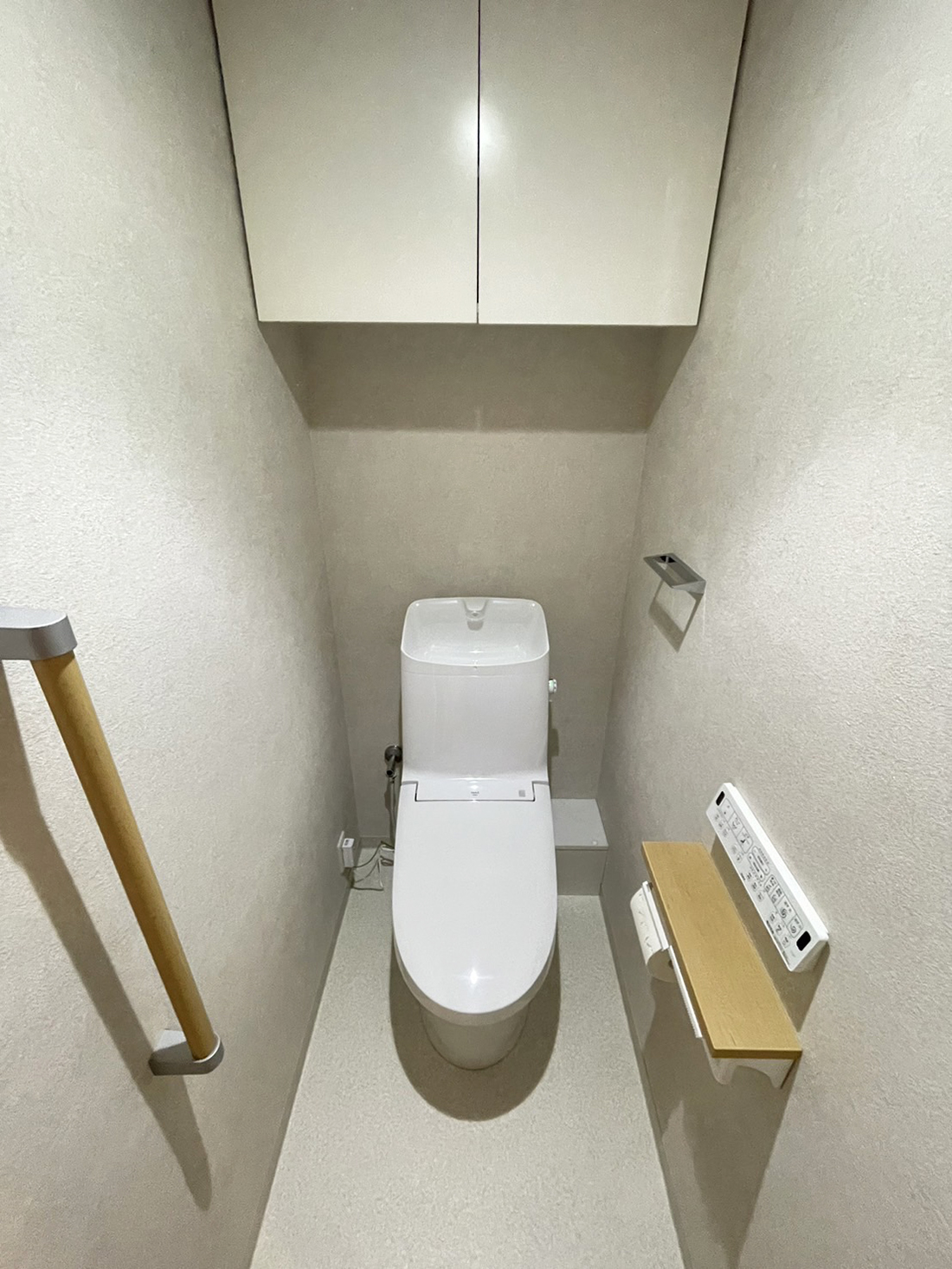 体重がかけれるように、座って右側には手摺、左側にはトイレットペーパーと兼用した体重をかけれるものを設置。