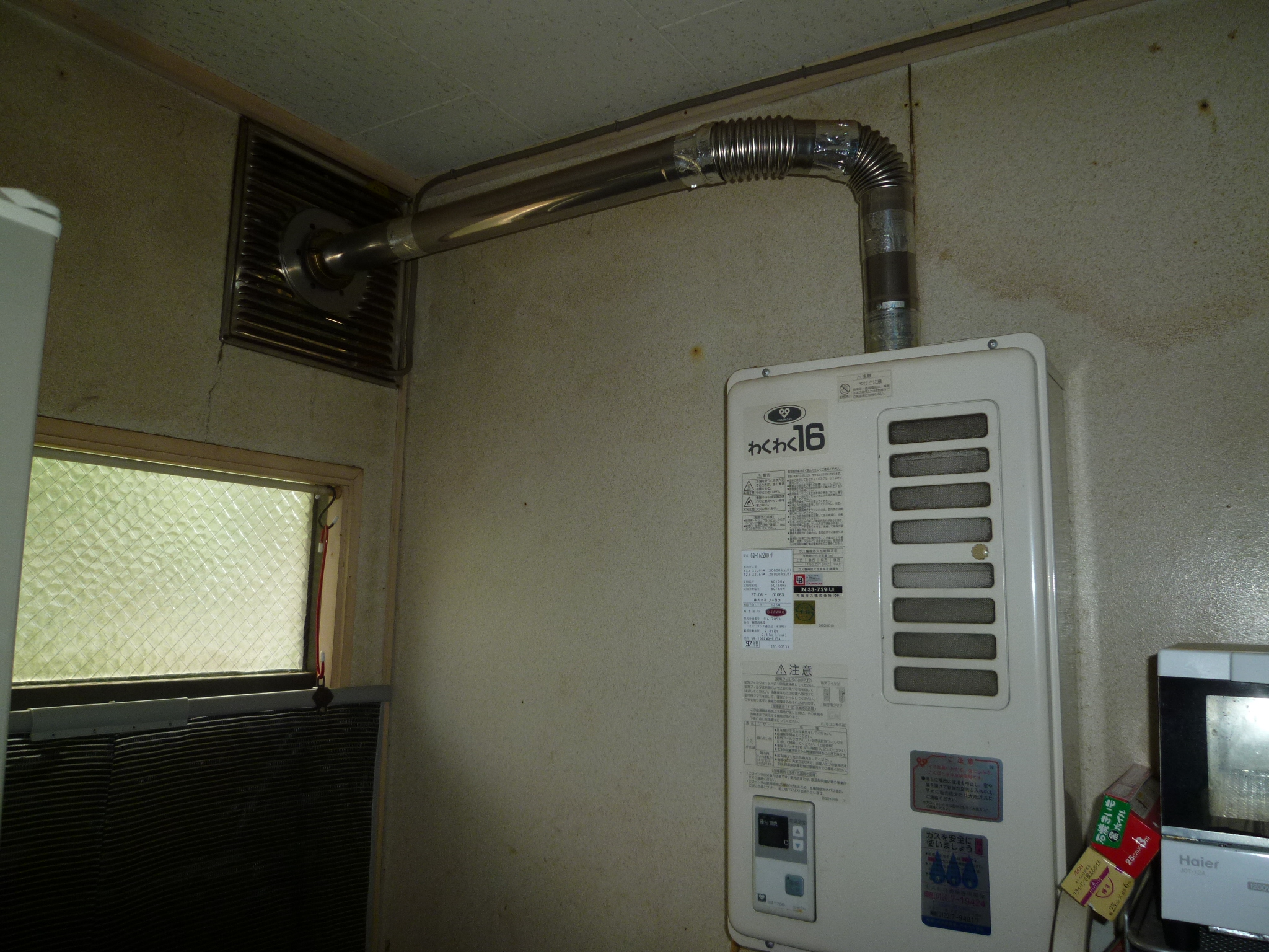 追炊き釜と屋内給湯器を取外し、自動タイプのガスふろ給湯器を取付け